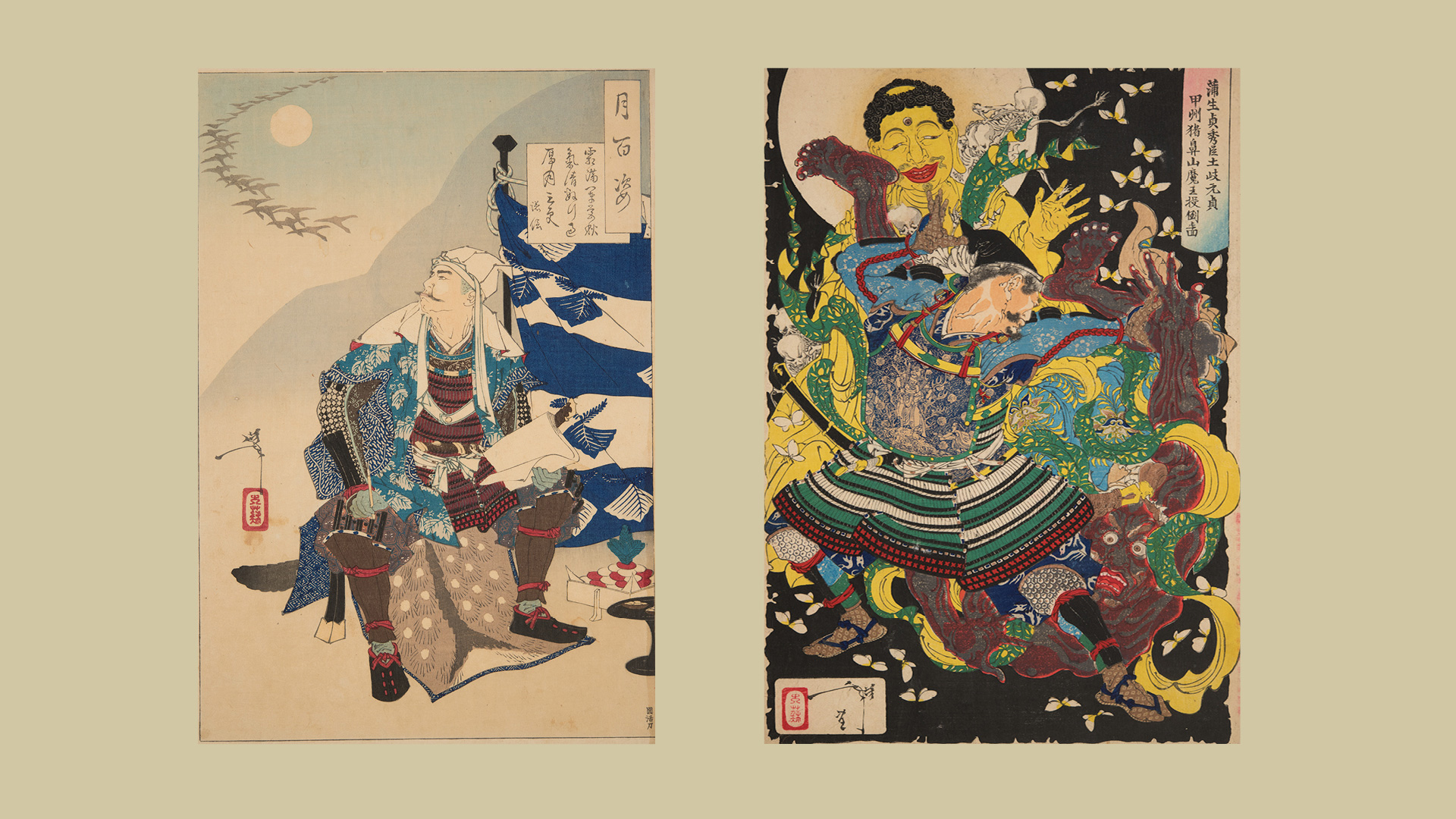 Among the last great ukiyo-e artists of Meiji Japan, Taiso Yoshitoshi (1839–1892) reigned supreme for his daring prints based on various tales and legends of ancient Japan and China. He made use of Western colors and inks for dramatic effect, yet stayed loyal to the woodblock print techniques that had guided past masters. In his short life, he created numerous series exploring a multiplicity of themes related to Japan’s rich history. In Brave Warriors, legendary warriors of Japan come to life to bring honor to themselves and their masters. In One Hundred Aspects of the Moon, exquisitely attired men and women are cast as theatrical players in settings that evoke melancholy, romance, and bravery. Fantastic creatures inhabit his series known as Thirty-Six Ghosts, featuring figures that both frighten and amuse the viewer with their dramatic design.